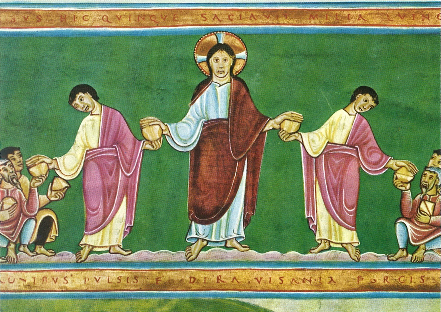 Jesus betet! Er, der Mittler zwischen Gott und Mensch in Person, stellt die Verbindung zum himmlischen Vater her: Er blickt zum Himmel, er spricht den Lobpreis und bricht das Brot. Und das solcherart „verwandelte“ Brot gibt er den Jüngern, die es weiterreichen. Sie werden von Jesus ermächtigt, den Menschen zu essen zu geben und so das Wunder auszuführen.